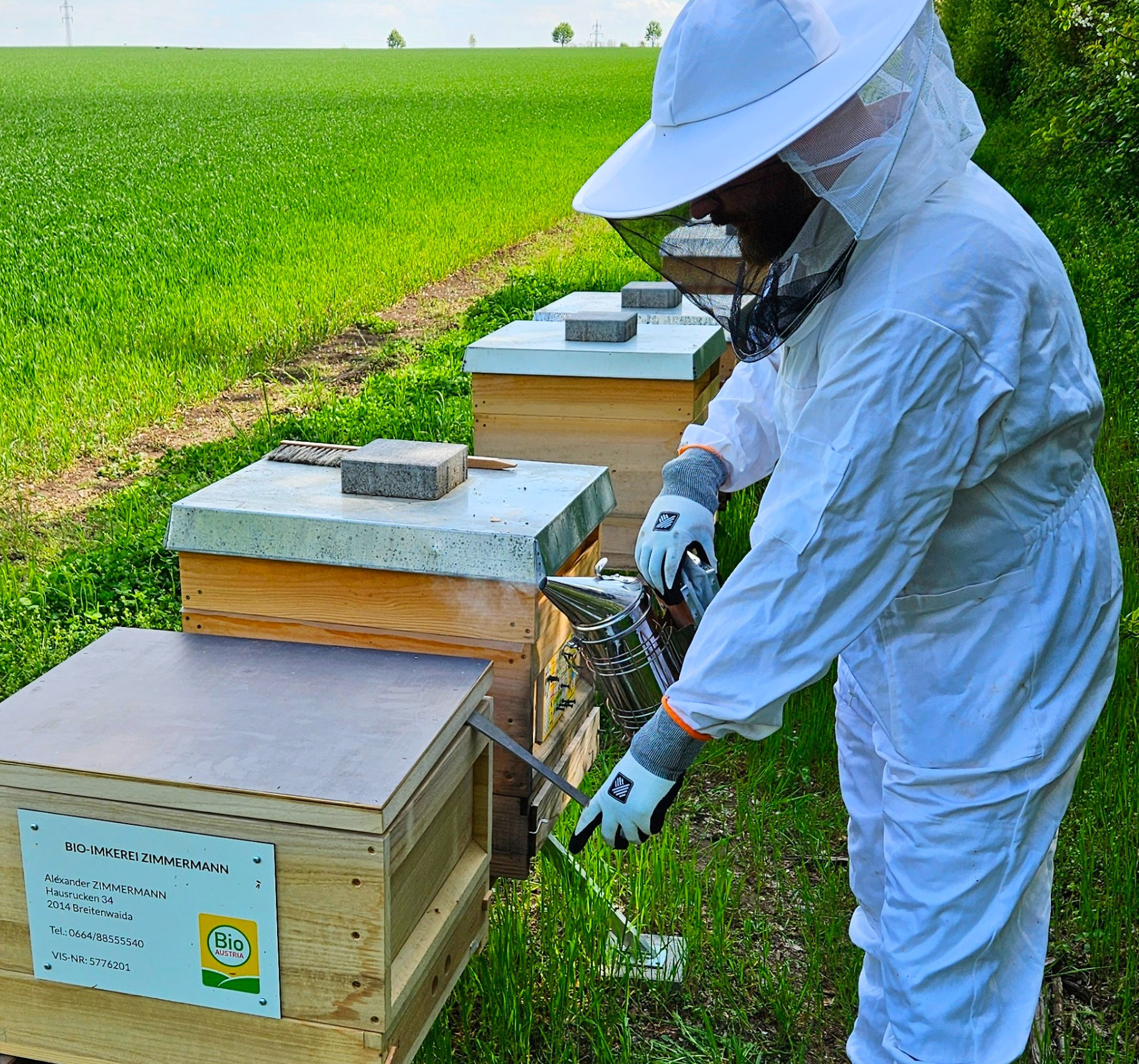 Je nach Stimmungslage, Wetter, und grundlegerer Persönlichkeit eines Volkes, sind die Bienen mehr oder weniger aggressiv und verteidigen sich gegen uns Imker, wenn wir den Stock öffnen. Natürlich gehören Stiche auch zum Imkern, aber so richtig Spaß macht uns das nicht. Um die Bienen etwas zu beruhigen beziehungsweise abzulenken, benutzen wir Rauch. Dafür geben wir trockene Pflanzenreste, Sägespäne, oder ähnliches in einen Smoker und erhitzen das, bis es zu rauchen beginnt. Für die Bienen ist der Rauch ein Zeichen, dass der Wald brennt. Als natürliche Reaktion, beginnen sie sich auf die Waben zu setzen und sich mit Honig vollzusaugen. Sie können dann nämlich bei einer eventuellen Flucht Nahrung mitnehmen. Dieser Reflex ist sehr hilfreich für uns, weil die Bienen dann eben mit Honigsaugen beschäftigt sind und sich nicht um die Eindringlinge kümmern. Wenn der Stock dann wieder verschlossen ist, und der Rauch abgezogen, lagern die Bienen den Honig einfach wieder in die Waben ein.