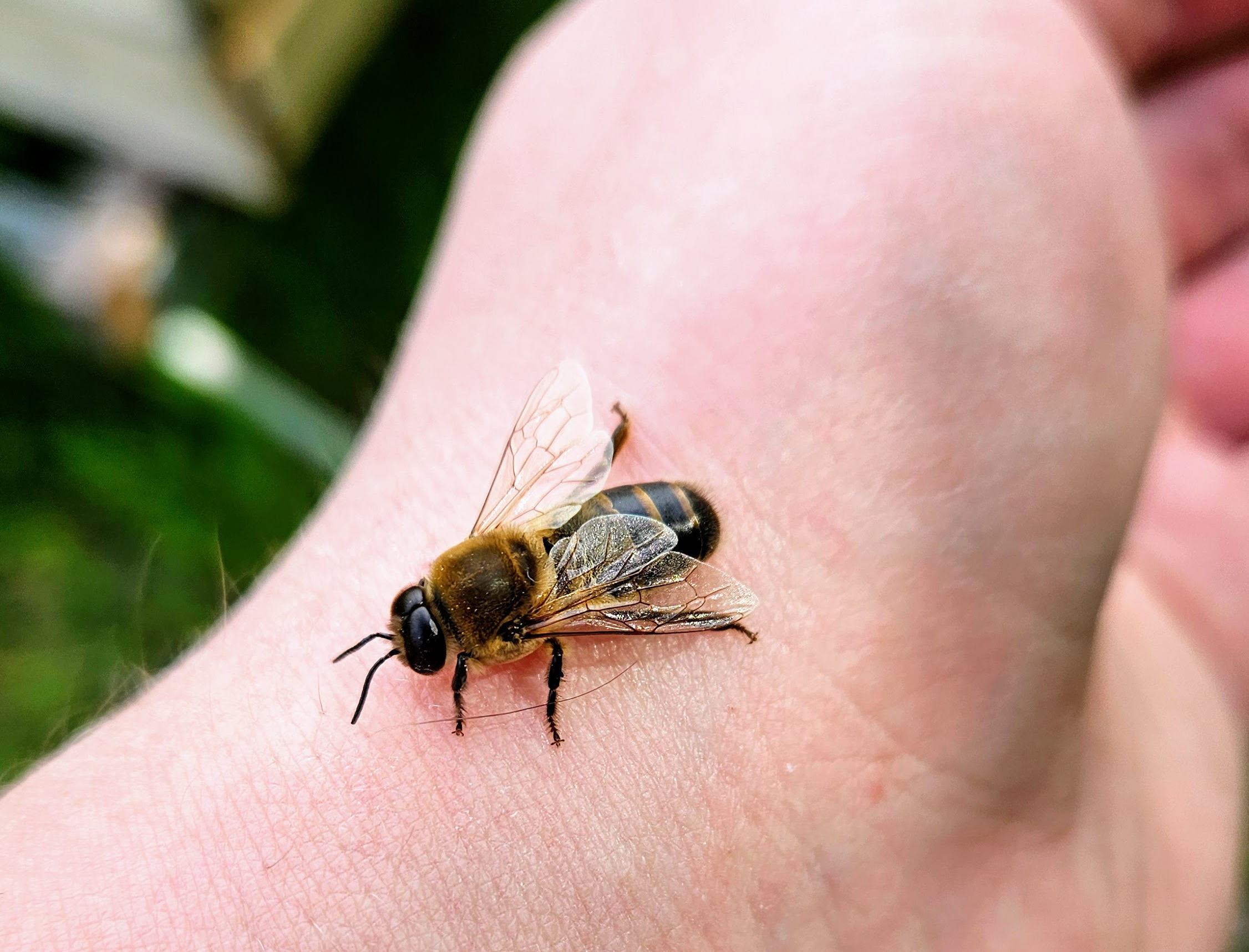 Die Drohnen sind männliche Bienen, deren einzige Aufgabe es ist, eine Jungkönigin zu begatten. Sie verrichten sonst keine Arbeit im Stock, sie können nicht einmal selber fressen, sondern müssen gefüttert werden. Die Drohen unterscheiden sich äußerlich von den Arbeiterinnen. Sie sind etwas größer und haben sehr starke Flugmuskeln, damit sie einer Jungkönigin schnell nachfliegen können. Um die Jungköniginnnen beim Hochzeitsflug besser entdecken zu können, haben Drohen auch größere Augen als normale Bienen. Und, Drohen haben keinen Stachel, damit die die Jungköniginnen nicht verletzen können. Drohnen sind also auch für uns ungefährlich und können vorsichtig gestreichelt werden.
